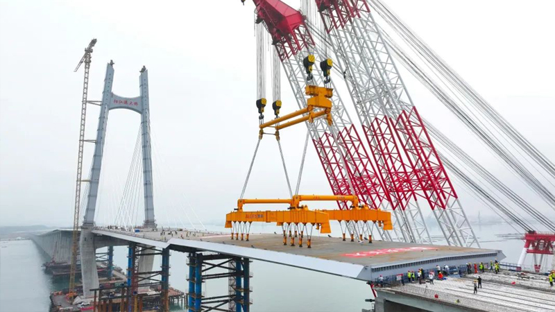 3月30日上午10時02分 隨著最后一塊鋼箱梁成功吊裝到位 陽江港大橋順利合龍 如一條巨龍橫臥海面 標志著廣東省濱海公路 海陵大堤段至溪頭段實現(xiàn)全線貫通 向通車目標邁出了重要一步! 陽江港大橋全長4777.2米 是廣東濱海旅游公路陽江海陵大堤 至溪頭段公路項目的控制性工程 由保利長大工程有限公司承建 巨力索具負責(zé)該項目鋼箱梁吊具制作 鋼箱梁采用大節(jié)段吊裝方案,分6個節(jié)段 最大梁段長90米,最小梁段長74.5米