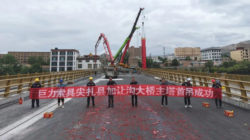 6月20日,加讓溝大橋主塔首吊作業(yè)取得圓滿成功,巨力索具股份有限公司承建了該項目的所有上部懸索結構,包括基座及主塔鋼結構,索鞍和索夾鋼結構,懸索橋主纜,吊桿用鋼拉桿及錨固鋼拉桿。