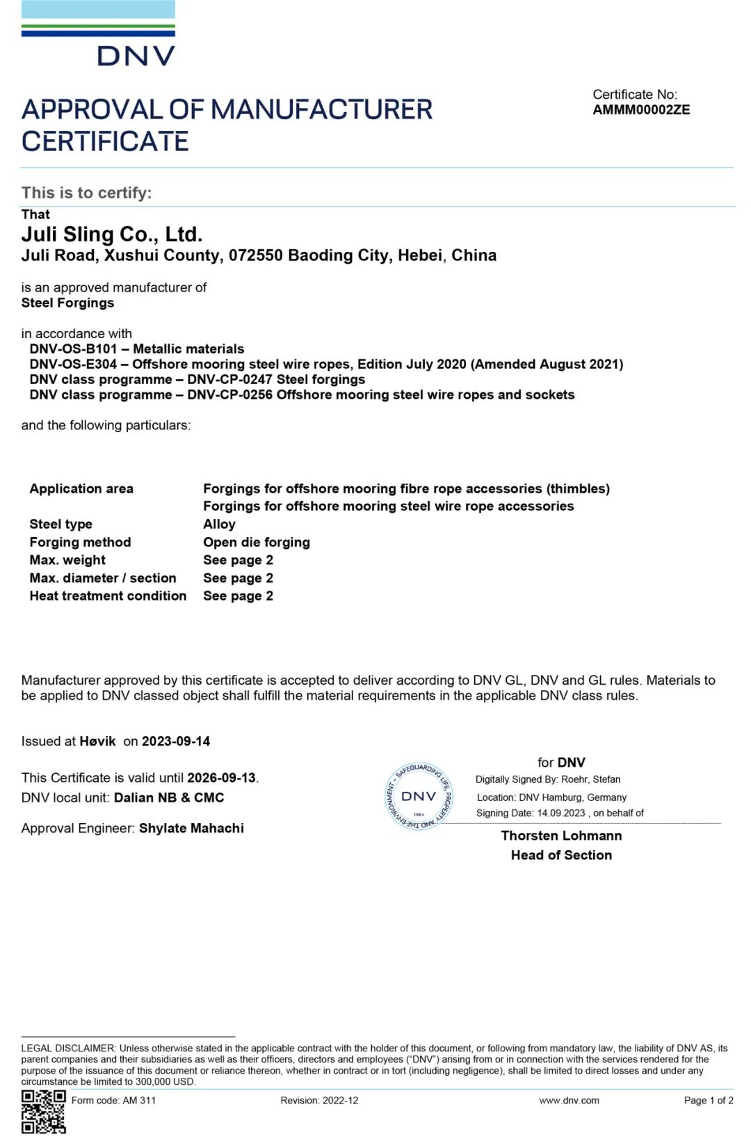 (DNV長期系泊鋼絲繩接頭及纜繩套環(huán)鍛件工廠認可證書)