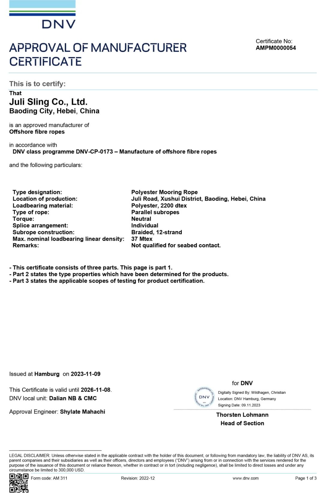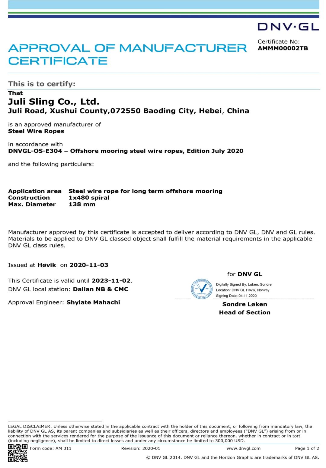 (系泊索DNV工廠認可證書)