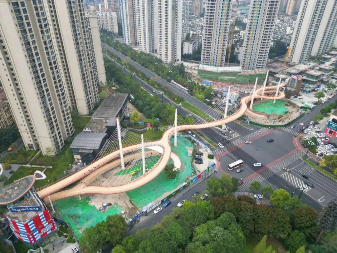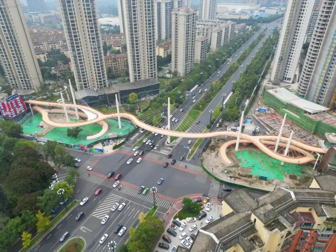 蜀龍路跨線橋主線全長249.6米,共包含7根索塔、100根鋼索以及24節(jié)段鋼箱梁。全橋采用鋼結(jié)構(gòu)實現(xiàn)靈動造型,沒有一座橋墩,通過7根索塔拉起1000余噸橋體。