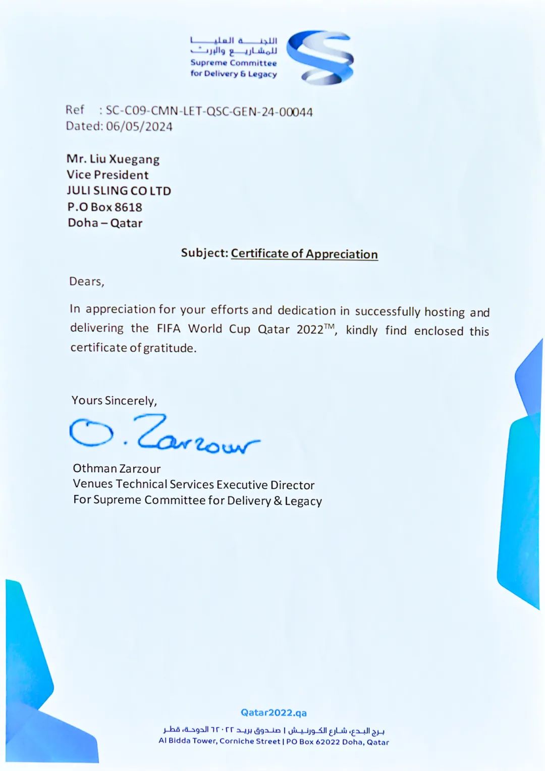 隨著2024年溫暖的春意,我們收到了來自項目業(yè)主——卡塔爾交付和遺產(chǎn)最高委員會(SUPREME COMMITTEE FOR DELIVERY & LEGACY)的感謝信及認可證書,這是對我們過往努力的最佳肯定。信中的每一個字句,都是對我們團隊辛勤工作和不懈努力的高度認可。這份榮耀不僅屬于我們,也屬于每一位支持和關(guān)注我們項目的人。您們的信任和支持是我們最寶貴的財富,是我們不斷前進的動力源泉。