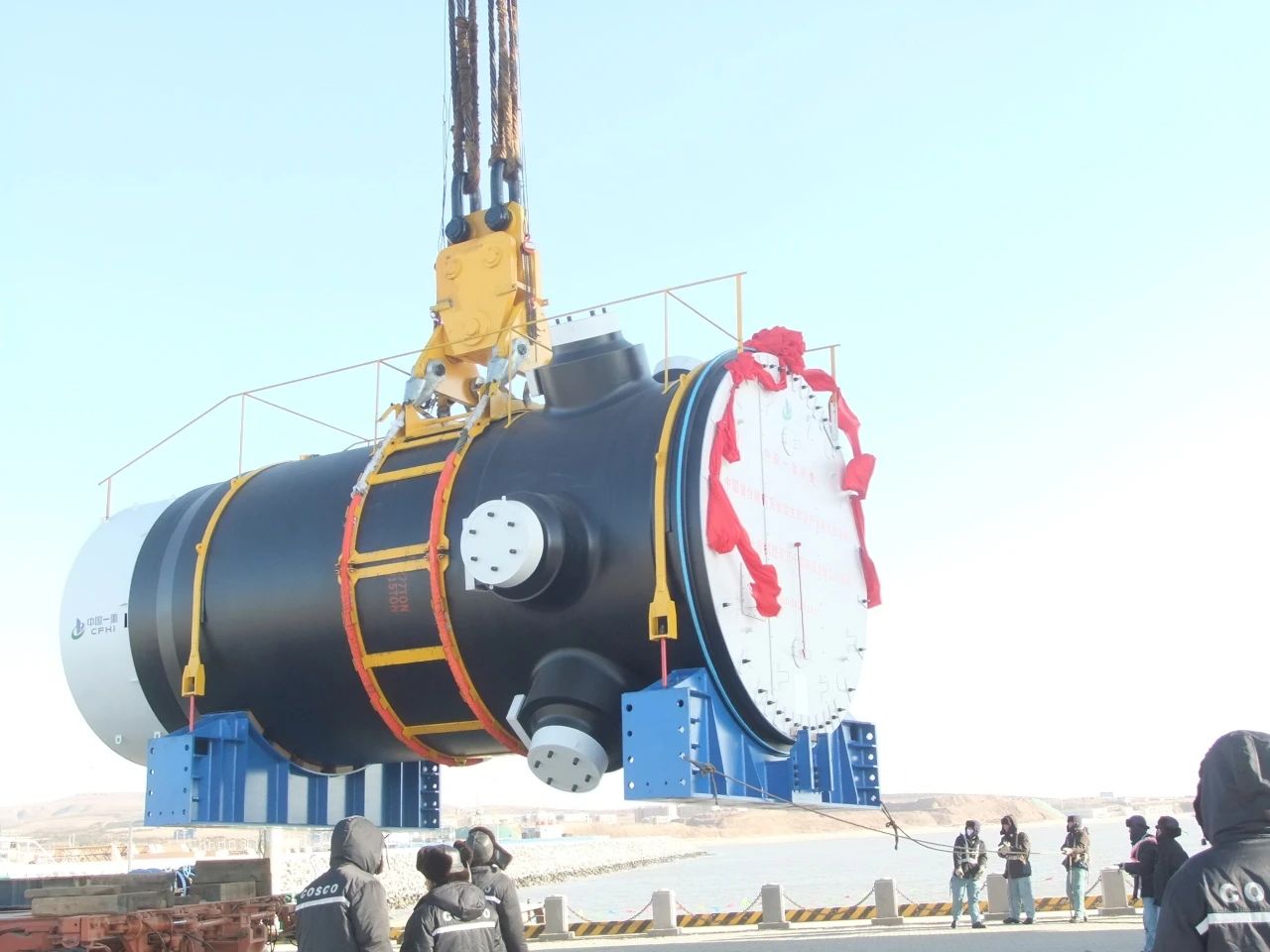 2024年1月,徐大堡核電1號機組CV底封頭開始吊裝,CV底封頭整體呈半橢球形殼體結(jié)構(gòu),具有重量大、體積大、就位精度高等特點。巨力索具所提供的轉(zhuǎn)接頭、分配器、吊索組成成套吊具解決受力問題,并全程配合吊裝過程,確保吊裝過程穩(wěn)步進行。