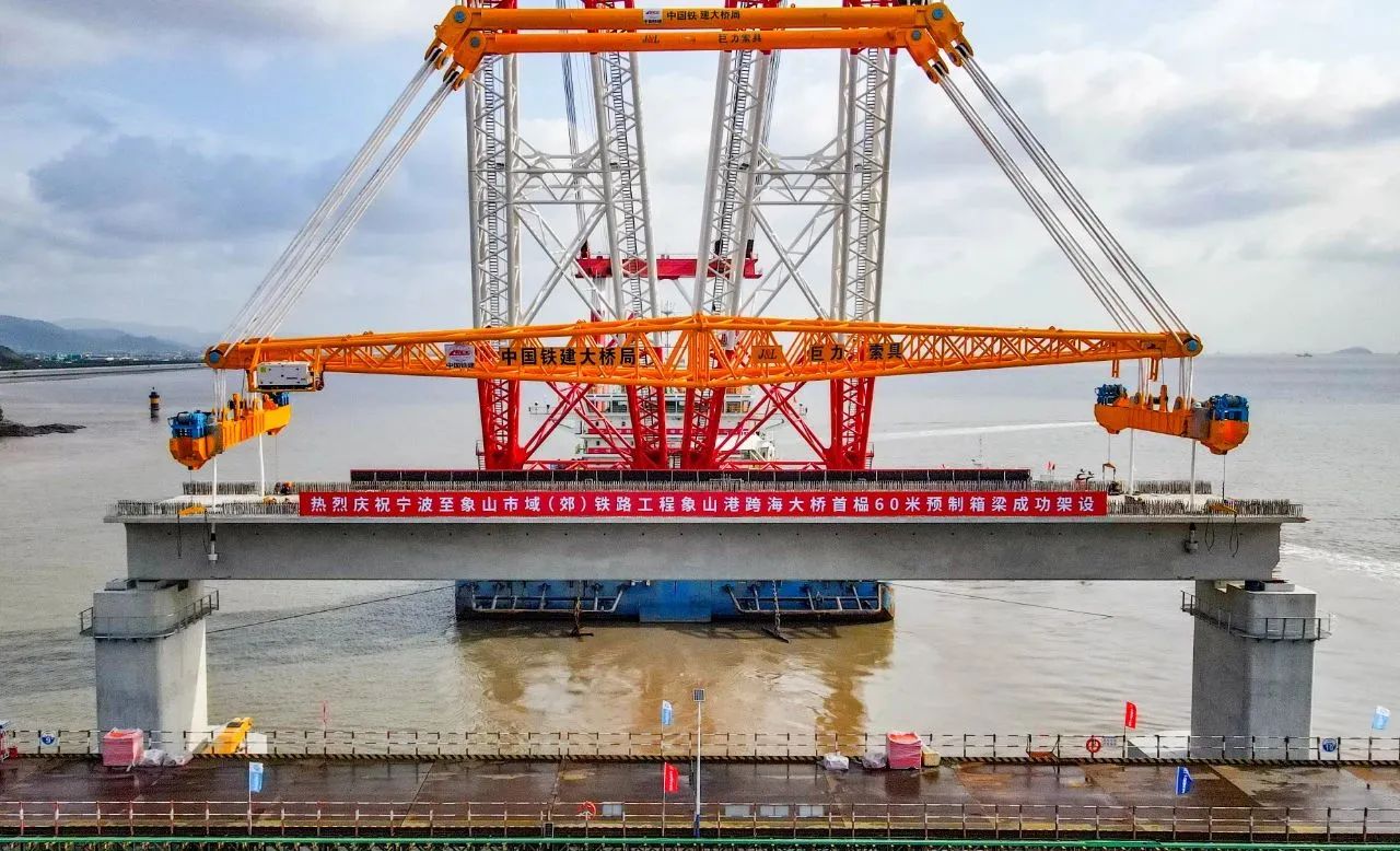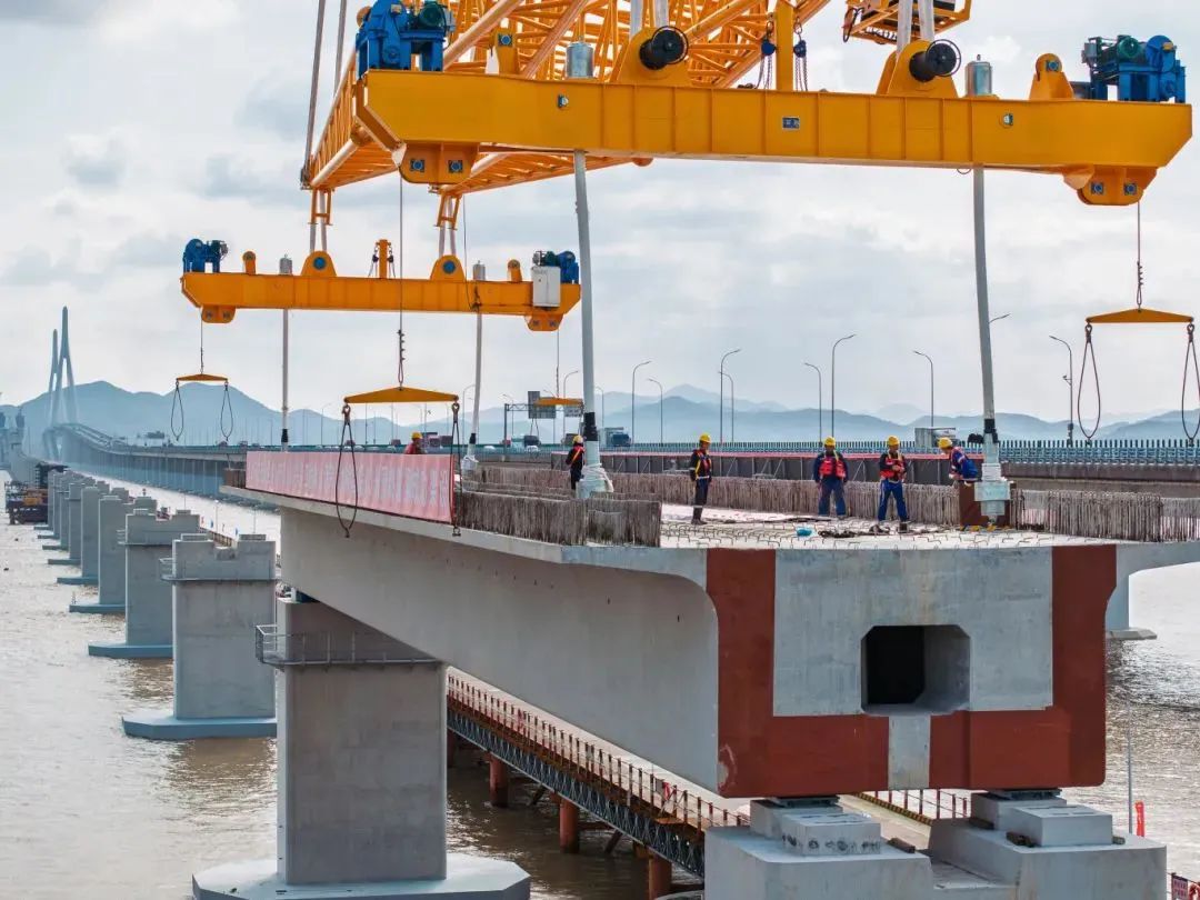 11月5日,隨著現(xiàn)場指揮一聲令下,國內(nèi)首座市域(郊)鐵路跨海大橋,重1700噸的預(yù)制箱梁穩(wěn)穩(wěn)落至橋墩上,巨力索具箱梁吊具全程保障首榀箱梁成功架設(shè),標(biāo)志著大橋全面進入上部結(jié)構(gòu)施工階段。
