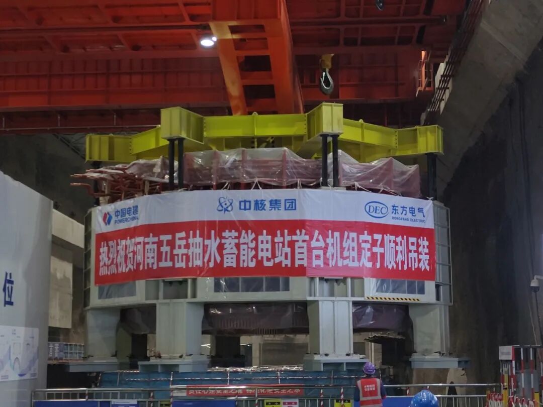 2024年3月27日,中國水電四局承建的河南五岳抽水蓄能電站首臺機組定子吊裝就位,巨力索具制造的350T定子起吊工具全程保障該項目吊裝順利進行,巨力索具從項目立項之初就與東方電機技術(shù)研發(fā)團隊反復(fù)優(yōu)化吊裝方案,確保吊具與定子外形尺寸高度契合,吊裝形式安全可靠。