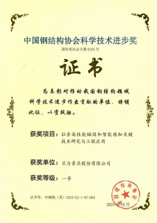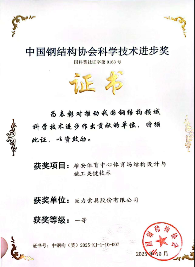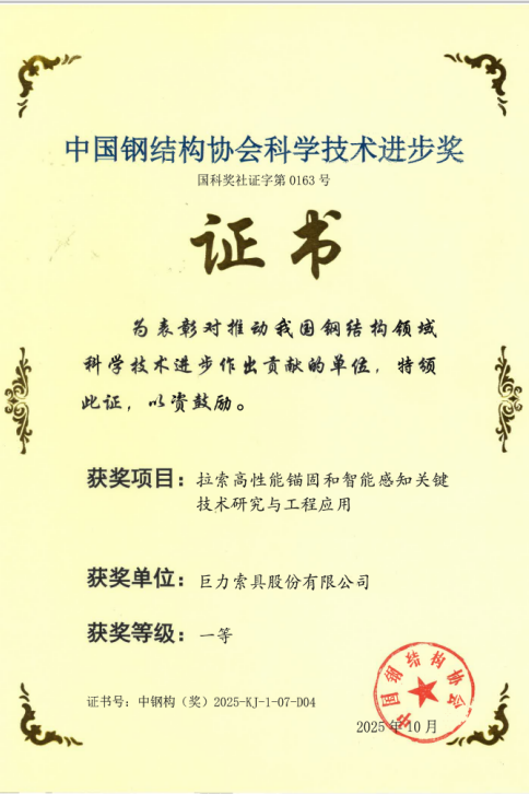 近日,2025年度中國鋼結(jié)構(gòu)協(xié)會科學(xué)技術(shù)進(jìn)步獎評審結(jié)果揭曉。在10月14日于廣西南寧舉行的頒獎典禮上,巨力索具股份有限公司憑借卓越的技術(shù)研發(fā)實(shí)力,一舉斬獲三項(xiàng)一等獎,充分彰顯了公司在高端索具技術(shù)領(lǐng)域的創(chuàng)新引領(lǐng)地位。