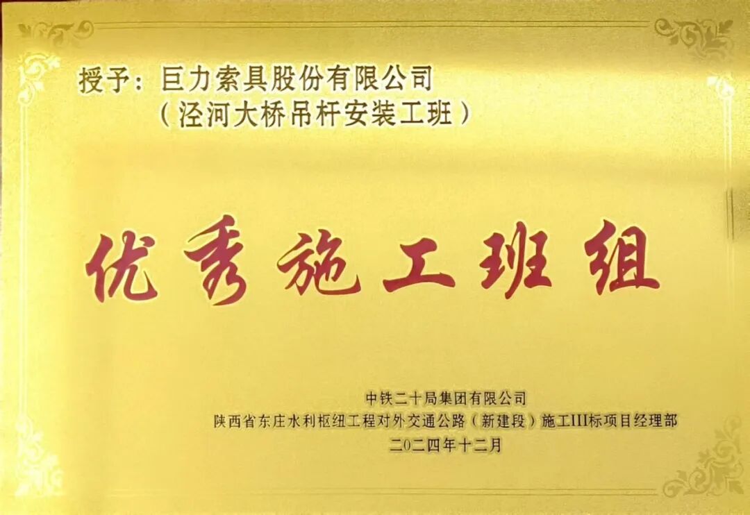 在吊索安裝環(huán)節(jié),巨力索具團(tuán)隊(duì)積極優(yōu)化作業(yè)流程,對(duì)吊索安裝張拉后的穩(wěn)定進(jìn)行觀測(cè),確保安裝進(jìn)度與質(zhì)量,為大橋的順利通車提供了關(guān)鍵保障。巨力索具團(tuán)隊(duì)也因出色的現(xiàn)場(chǎng)表現(xiàn),被項(xiàng)目部授予“優(yōu)秀施工班組”的榮譽(yù)稱號(hào)。