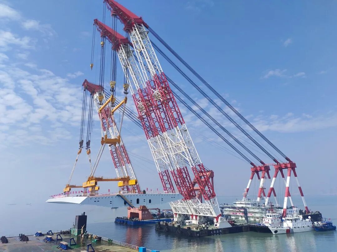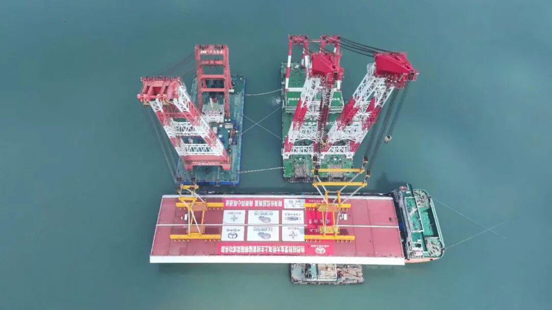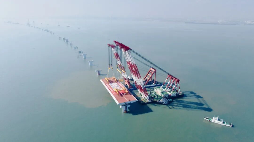廈金大橋(廈門段)總長約19.6公里,本次吊裝的鋼箱梁位于大嶝西航道橋東側(cè)的90-91號(hào)墩,梁長142.5米、寬44米、高4.5米,總重量4586噸,堪稱“海上巨無霸”。該梁段的成功架設(shè),刷新了海上裝配式橋梁整孔架設(shè)鋼梁的重量記錄,也為行業(yè)內(nèi)淺灘海域“智能裝配化”造橋提供了重要實(shí)踐。