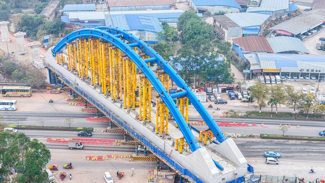 該項目位于廣西欽州市欽北區(qū),線路全長4.138公里,其中長達3.293公里的特大橋——跨欽州灣大道鋼管拱橋,是全線的控制性工程。