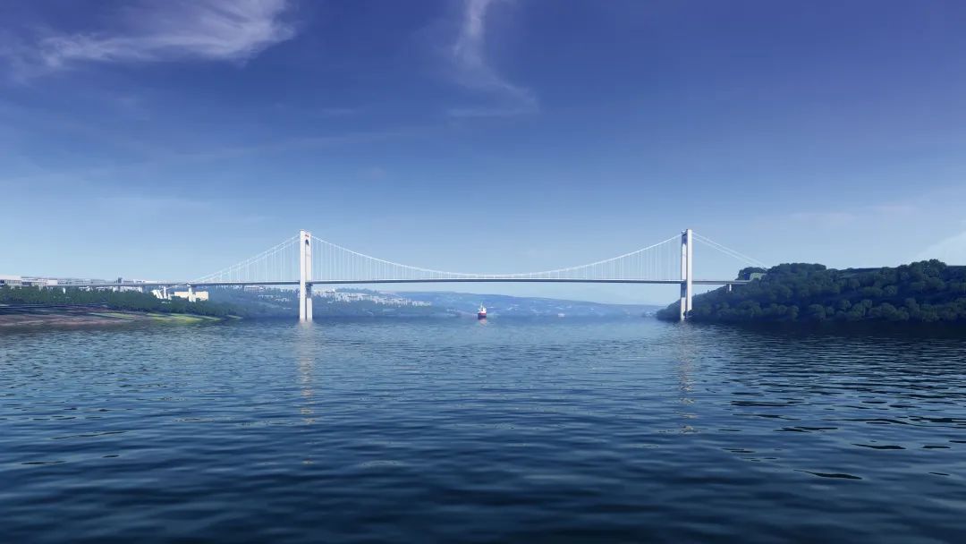 主橋?yàn)橹骺?90米雙塔雙索面鋼箱梁懸索橋