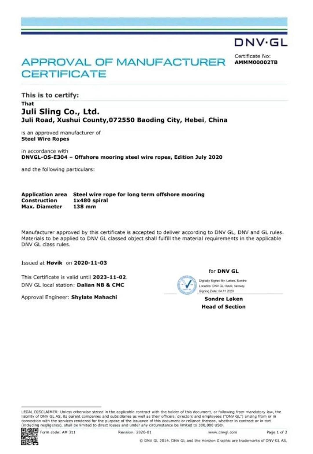 同時,巨力索具系泊產(chǎn)品通過了DNV·GL工廠認(rèn)證成為國內(nèi)首家通過該類鋼絲繩DNV·GL工廠認(rèn)可的廠家。系泊索各項(xiàng)指標(biāo)達(dá)到了國際先進(jìn)水平,標(biāo)志著我國浮式海上風(fēng)電永久系泊關(guān)鍵裝備的研發(fā)設(shè)計(jì)、生產(chǎn)制造以及國產(chǎn)化上實(shí)現(xiàn)了新突破,為我國深遠(yuǎn)海浮式風(fēng)電商業(yè)化發(fā)展以及關(guān)鍵技術(shù)及裝備國產(chǎn)化奠定了堅(jiān)實(shí)基礎(chǔ)。