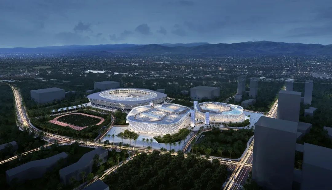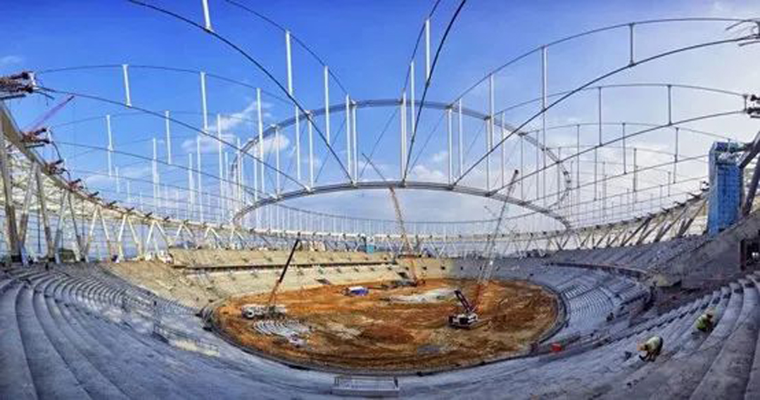 該體育場整體外輪廓平面投影為不規(guī)則的倒角五邊形,其外輪廓南北最大長度約305米,東西約270米,罩棚最高點標高約46米。從體育場內(nèi)的觀眾席處仰望,一根根鋼索交織連接,各自用力拉伸,巨大鋼網(wǎng)架躍然呈現(xiàn),好似一座兼具了力學(xué)、美學(xué)、科技的藝術(shù)品。