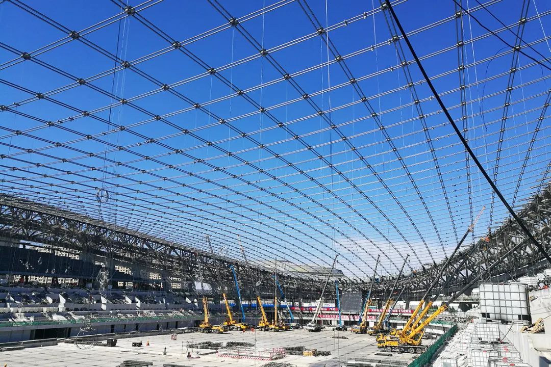 盧塞爾體育場是2022卡塔爾世界杯主體育場,最多可容納92000人。該體育場外形以阿拉伯椰棗碗和琺瑯燈籠為設(shè)計靈感,屋頂為雙曲面構(gòu)造,造型呈馬鞍形,東西高,南北低,整個體育場投影為圓形。屋面主索網(wǎng)采用魚腹式索網(wǎng)結(jié)構(gòu),跨度達到274米,最大懸挑距離為76米,該結(jié)構(gòu)形式為首次應(yīng)用,無論是對產(chǎn)品的制造,還是施工安裝都具有極大的挑戰(zhàn)。因此盧賽爾體育場也成為了全球最大跨度雙層交叉索網(wǎng)屋面單體結(jié)構(gòu)。同時也是設(shè)計標準最高的索網(wǎng)屋面單體建筑。整個索網(wǎng)結(jié)構(gòu)從產(chǎn)品原材料到成品制造以及施工安裝均超過了歐美標準要求,巨力索具憑借過硬的實力成為一級專業(yè)分包,負責執(zhí)行整個屋頂索膜結(jié)構(gòu)體系的設(shè)計、供貨、安裝總承包工作。