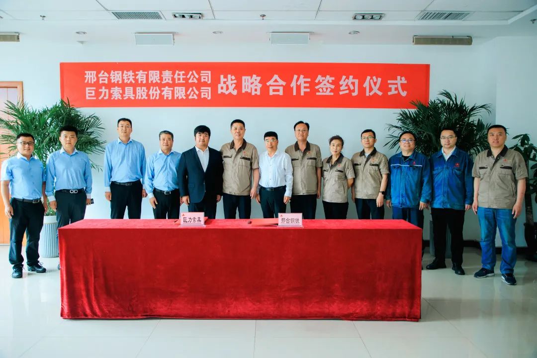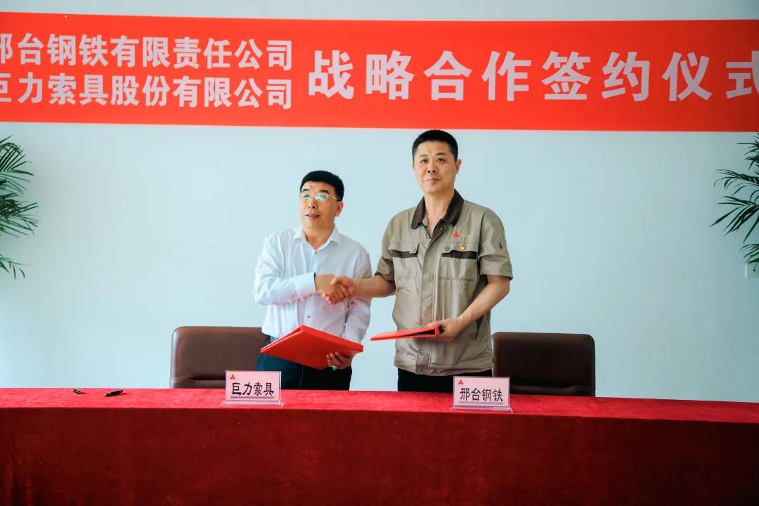 2023年6月19日,巨力索具與邢臺鋼鐵簽訂戰(zhàn)略合作協(xié)議,邢臺鋼鐵董事長張育明,巨力索具董事長楊建國、總裁楊超出席簽約儀式,并就合作情況展開詳細座談。